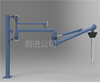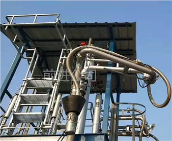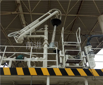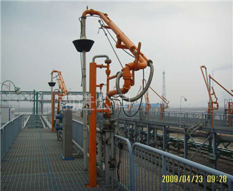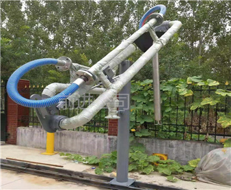 密閉式頂部裝卸臂由5個旋轉(zhuǎn)接組成回轉(zhuǎn)**,液相4個,氣相1個。氣相一般為DN50,液相根據(jù)客戶需要的流量選擇。氣相在轉(zhuǎn)接處使用金屬軟管連接,保證鶴管的旋轉(zhuǎn)靈活性。鶴管液相接口朝下,氣相接口朝上,一般氣相會多臺匯總在一個主管上,如果單臺排空的話,需要加帶雨帽的阻火器,**管道進(jìn)入點(diǎn)燃源。垂管上有一個錐形密封帽,裝車時垂管插到槽車的頂部灌口,密封帽壓實(shí)在灌口處,鎖緊外臂鎖緊桿(或者氣缸壓緊,在和油氣回收配合使用時,建議鶴管增加氣缸,達(dá)到充分密閉的作用,因?yàn)榭盏牟圮囋谘b車時物料逐漸增多,槽車輪胎壓扁,槽車降低,密封帽就不能很好的密封了,必須有氣缸對密封帽有一個壓力,才能使密封帽始終跟緊灌口。達(dá)到有效密閉的效果,油氣回收需要密閉效果達(dá)到90%-95%)密封帽密閉后,槽車?yán)餁饣慕橘|(zhì)就能通過鶴管上的氣相管道排空或者抽入油氣回收系統(tǒng)